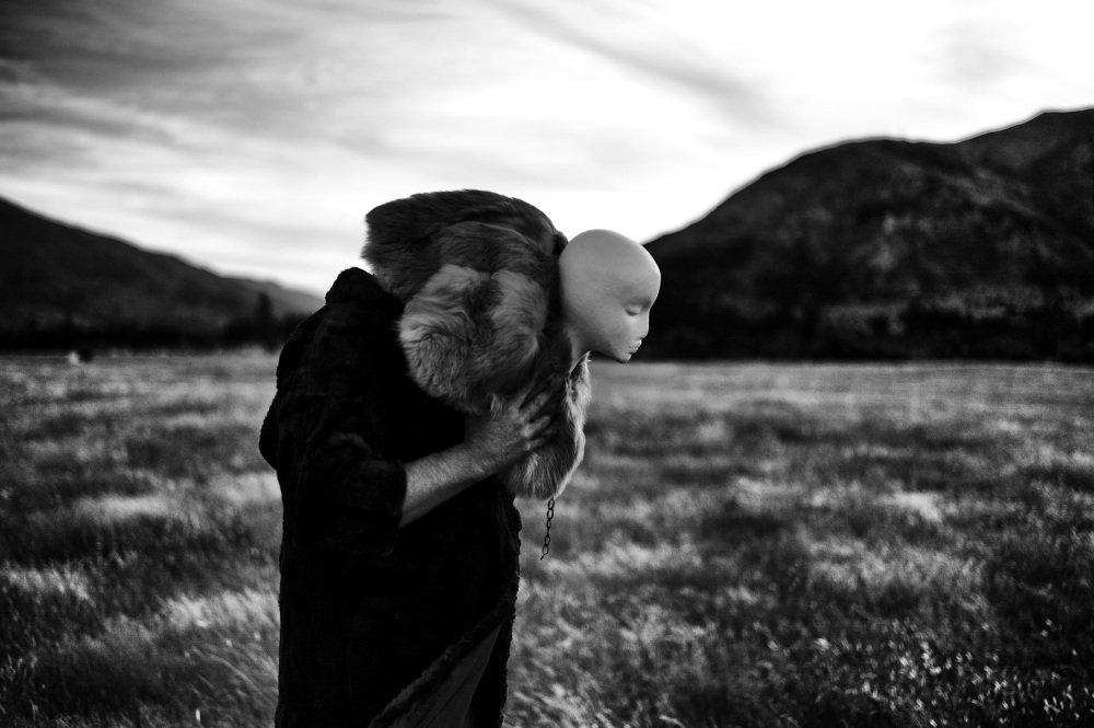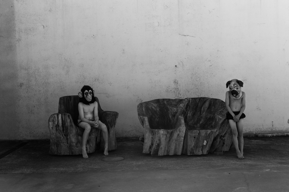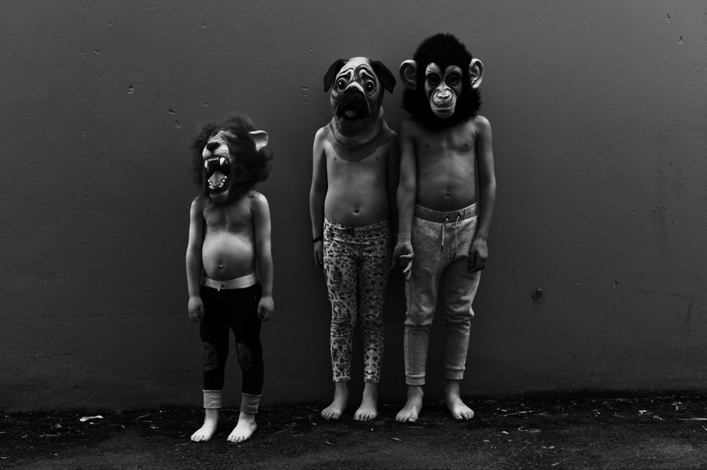 My backyard is the set. It is barren, cold and the props create tension. I focus on the characters – they are disguised, obscured - they taunt, spook and challenge the traditional sense of a backyard scene. They seem surprised by being caught in the image. The audience is unseen. The plot and dialogue is humorous and playful, yet spooky, surreal and disturbing.